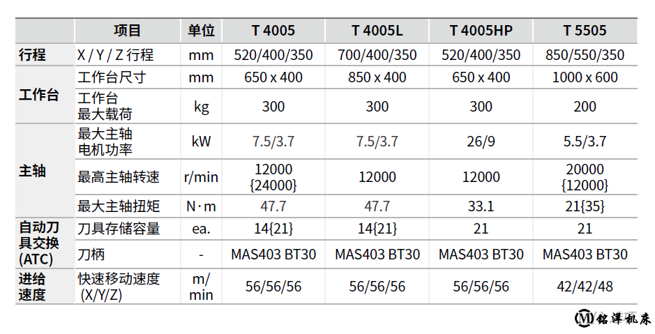 T 4005 / 4005L / 4005HP / 5505 配备伺服ATC和高可靠性主轴, 提高生产效率的 T系列...