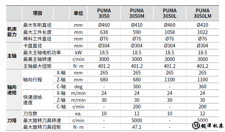 PUMA 3050 / 3050M / 3050L /3050LM 伺服刀塔,高速的进给速度,12英寸卡盘...